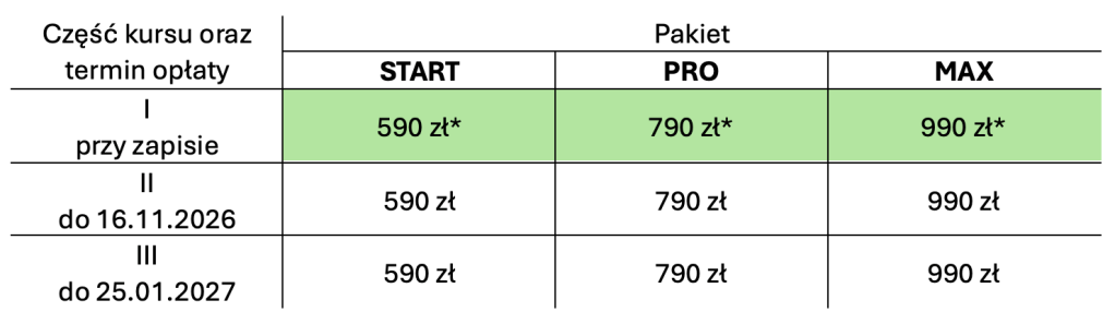 Opłata za kurs następuje w trzech częściach: